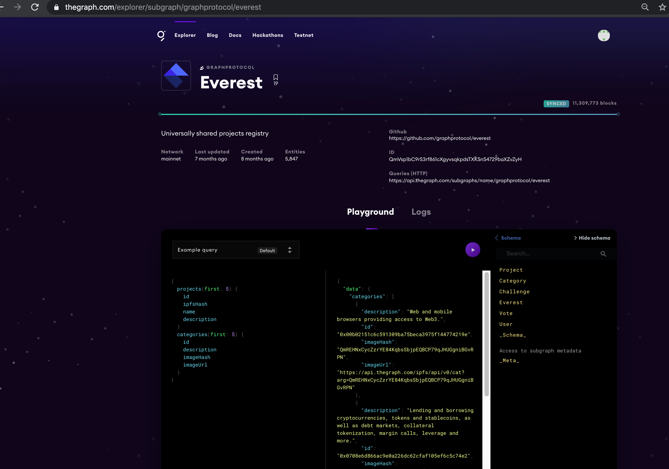 Ví dụ bên dưới tôi đang yêu cầu thông tin của 5 dự án và 5 loại (categories) đầu tiên từ subgraph Everest xây dựng trên giao thức mạng The Graph.![]()