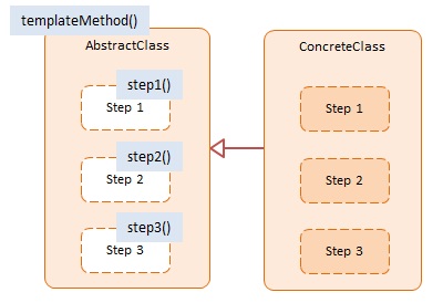 An easy way to think of Template Method is that of an algorithm with holes (see diagram below). It is up to the developer to fill these holes with appropriate functionality for each step.