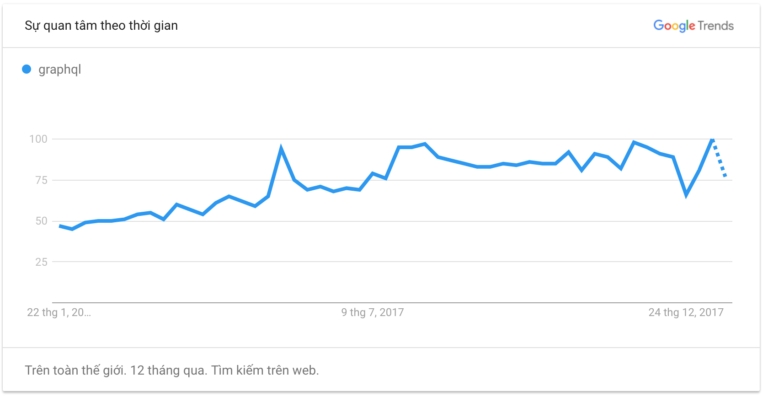 Biểu đồ của Google Trends cho thấy Graphql đang có xu hướng tăng đều trong thời gian qua chứng tỏ Graphql đang phát triển tốt. Mặc dù Graphql không quá nóng bỏng như các frontend React/Vue/Angular với lượng người sử dụng lớn, nhưng điều đó không có nghĩa là Graphql nhận được ít sự quan tâm của mọi người