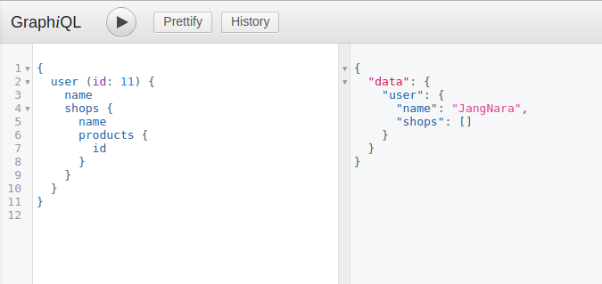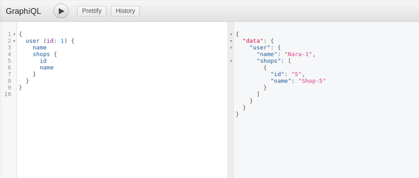 Một trong những ưu điểm chính của GraphQL là nó cho phép truy vấn thông tin lồng nhau một cách tự nhiên. Ví dụ: nếu bạn muốn lấy tất cả thông tin user kèm với tên của shops mà user đó sở hữu: