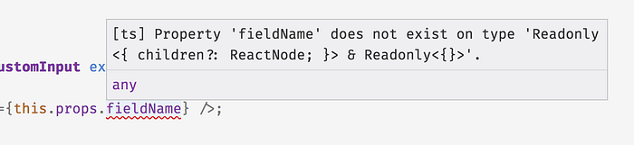 Property 'fieldName'— We saw this language before with the<input>’snmaeattribute, but now it’s referring to a “property” on thethis.propsobject, rather than one on an HTML tag.does not exist on type— This is also the same language. TypeScript has an opinion about what properties are and are not onthis.props, andfieldNameis in the “not” pile.'Readonly<{ children?: ReactNode; }> & Readonly<{}>'— OK, this is hard to read. This is the type that TypeScript thinks of when we saythis.props.