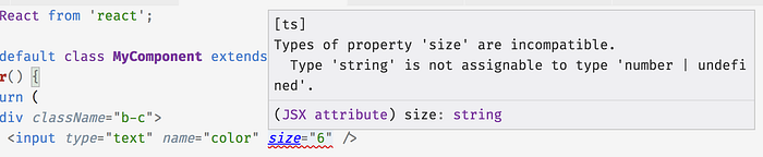 Types of property 'size' are incompatible.— Chúng ta đang nói vềsizehiện tại. Lưu ý cách nó nói "types" ở dạng số nhiều. Đó là vì tất cả các lỗi kiểu đều là sự không nhất quán . Lỗi này nằm giữa hai kiểu: một kiểu từ mã của chúng ta và một kiểu từ<input>định nghĩa của React (hãy nhớ lạiDetailedHTMLProps<…>phần chúng ta đã thấy trong lỗi trước).Type 'string'— Đây là kiểu đầu tiên, kiểu cho đối số mà chúng ta đã viết,"6"là một chuỗi, vì tất cả các thuộc tính JSX được trích dẫn đều là chuỗi.is not assignable to— Đây là cách diễn đạt tinh tế của từ “không phải”. Nó làm rõ điều “không tương thích” giữa hai loại.type 'number | undefined'— Đây là kiểu thứ hai trong hai kiểu, kiểu mà thư viện React cho là phù hợp với thuộc tính<input>'ssize. The|được gọi là toán tử “union”, nhưng bạn có thể đọc là “or”: “sizephải là một số hoặc không xác định”.