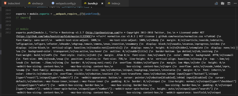 Thì sau khi bundle nó sẽ tạo ra 2 file là bundle.js và 1 file .svg. Thì .svg chứa bộ icon của bootstrap thôi. Để ý file bundle.js thì webpack sẽ include luôn css của bootstrap trong file bundle.js luôn. Và sau khi script loaded xong thì nó sẽ inject cái đống css này vào tag <style>