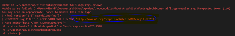 Có hai lỗi xảy ra ở đây là webpack không có loader cho file và loader cho url nên tới cái chỗ require file font và require cái gì svg gì trên url như trong hình nên webpack nó không bundle được.
