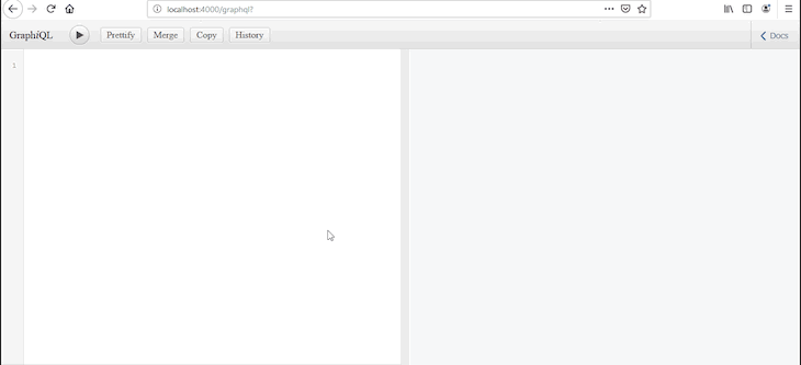 Once the server is good to go, running the app with node index.js will start the server on http://localhost:4000/graphql. We can query for hello and get the string “World” as a response.