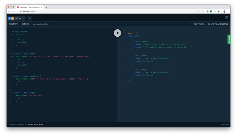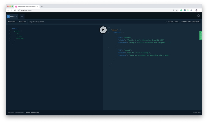 , ... Để kiểm tra mutation chúng ta vừa tạo có thực sự hoạt động hay công, chúng ta sẽ gửi query lấy tất cả các posts