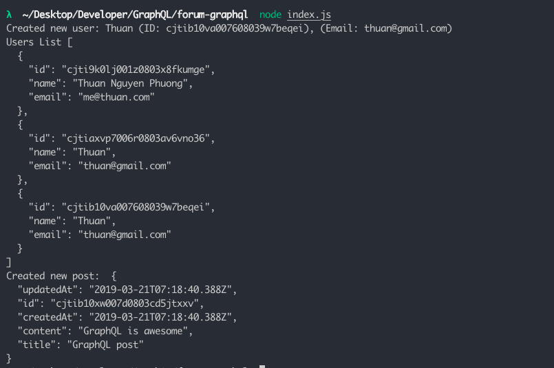 Và đây là kết quả, chúng ta cũng có thể kiểm tra trong Prisma Admin (http://localhost:4466/_admin)