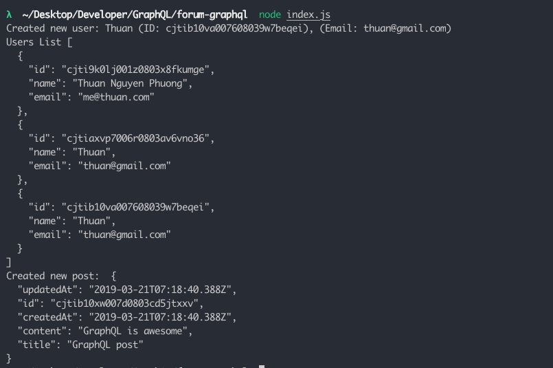 node index.jsVà đây là kết quả, chúng ta cũng có thể kiểm tra trong Prisma Admin (http://localhost:4466/_admin)