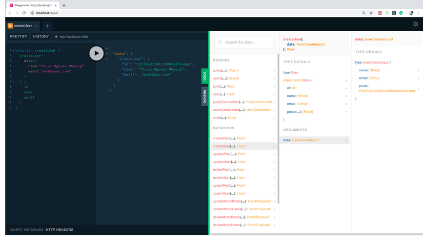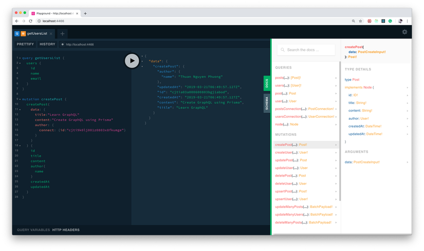 Truy cập http://localhost:4466 và thao tác một số câu Query và Mutation: