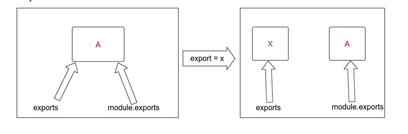 2 biến exports và module.exports đều cùng trỏ vào một vị trí nhớ, vì vậy khi ta add thêm trường hoặc function bằng một trong hai biến đó thì vùng nhớ A sẽ được có thêm các thành phần được add