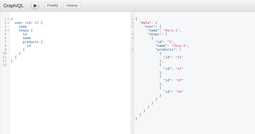 Một trong những ưu điểm chính của GraphQL là nó cho phép truy vấn thông tin lồng nhau một cách tự nhiên. Ví dụ: nếu bạn muốn lấy tất cả thông tin user kèm với tên của shops mà user đó sở hữu: