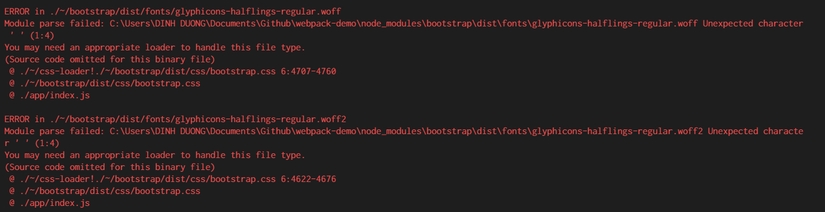 Có hai lỗi xảy ra ở đây là webpack không có loader cho file và loader cho url nên tới cái chỗ require file font và require cái gì svg gì trên url như trong hình nên webpack nó không bundle được.