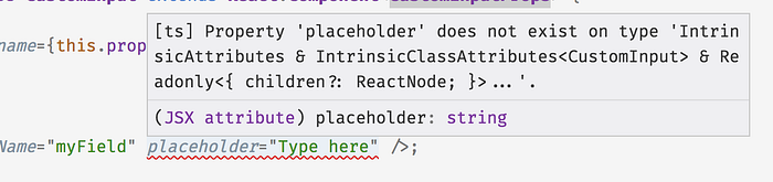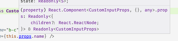 React.Component<CustomInputProps, {}, any>— This is Visual Studio telling us whatthisis. It closely matches theextends React.Component<CustomInputProps>from our class declaration, just with the default values forCustomInputProps’s 2 additional type parameters written out explicitly..props:— Because that’s what we’re hovering over.Readonly<{ children?: React.ReactNode; }> & Readonly<CustomInputProps>— Remember thisReadonlystuff from before? Now it hasCustomInputPropsinstead of{}.