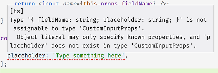 Type '{ fieldName: string; placeholder: string; }'— This is the new type of our object literal. See how it now has theplaceholderproperty.is not assignable to type 'CustomInputProps'.— Same as before. TypeScript thinks this assignment is illegal.Object literal may only specify known properties, and 'placeholder' does not exist in type 'CustomInputProps'.— This is the explanation for why this case is “not assignable.”CustomInputPropsdoesn’t have aplaceholderproperty declared in itsinterfaceblock.