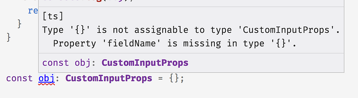 Type '{}'— Đây là TypeScript mô tả kiểu giá trị mà chúng ta đang cố gắng gán choobj: một đối tượng không có trường nào.is not assignable to— Người bạn cũ của chúng ta “không thể gán cho”. Chúng ta đang cố gắng thực hiện một phép gán: gán cho{},objnhưng TypeScript lại nói rằng chúng ta không thể làm điều đó.type 'CustomInputProps'.— Đây là vì nó là thứ chúng ta đã tuyên bốobj. Do đó, nó là kiểu được gán cho .Property 'fieldName' is missing in type '{}'.— Bây giờ TypeScript đang nêu rõ lý do tại sao một đối tượng có kiểu{}không thể gán cho thứ gì đó có kiểuCustomInputProps: Không cófieldName, và, theointerfacekhai báo ở trên, tất cảCustomInputPropscác đối tượng phải cófieldName.