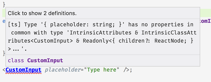 We can see the { placeholder: string; } type from the createElement statement that’s behind the scenes, and the IntrinsicAttributes & … type for CustomInput’s props. It’s just for a reason I don’t know TypeScript says “has no properties in common” rather than “does not exist.”
