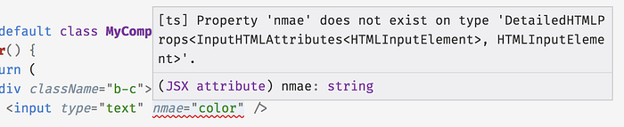Property 'nmae'— The “properties” are the attributes on the<input>tag. So this error is about “nmae=”…"”.does not exist on type— There’s a “type,” a definition somewhere of what is allowed to be on<input>, and “nmae” isn’t on the list.'DetailedHTMLProps<InputHTMLAttributes<HTMLInputElement>, HTMLInputElement>'— OK, this is a doozy. This describes how TypeScript thinks of<input>’s attributes. All of these names (DetailedHTMLProps,InputHTMLAttributes, andHTMLInputElement) are defined in that React library.DetailedHTMLPropsmeans attributes that any HTML element can have (likeid,tabIndex, andstyle) andInputHTMLAttributesare for ones specific to<input>elements (name,value, &c.). This is boilerplate you can typically gloss over, but theHTML***Elementpart can be a useful clue in deciphering this.
