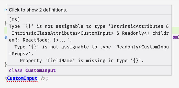 Now let’s see what happens when we put back fieldName, but also add a field that’s not part of the CustomInputProps type:
