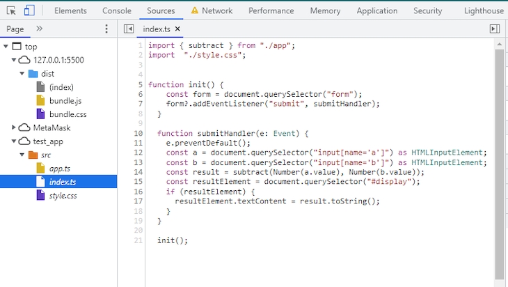 When you’re debugging your code on a browser’s DevTool, you’ll notice that only the bundle files appear. Whenever there is an error in our TypeScript code, it’ll only be indicated in the bundle file, making it hard to trace errors back to TypeScript for correction. However, with a source map, we can easily debug TypeScript using our DevTool: